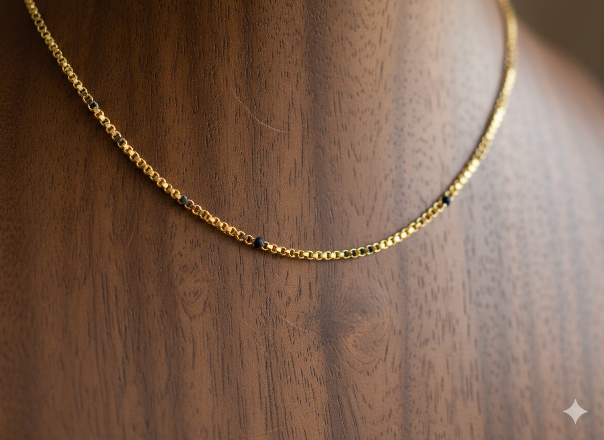 Black Beads Chain is a premium quality one gram gold jewellery design crafted with durable rolled-gold coating. It offers the look of real gold while remaining affordable and lightweight. Ideal for weddings, festivals, and everyday fashion.