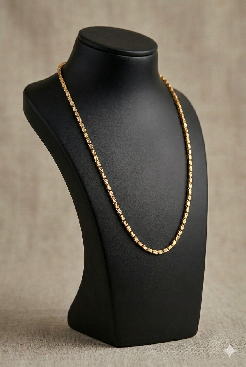 Box Cut Chain is a premium quality one gram gold jewellery design crafted with durable rolled-gold coating. It offers the look of real gold while remaining affordable and lightweight. Ideal for weddings, festivals, and everyday fashion.