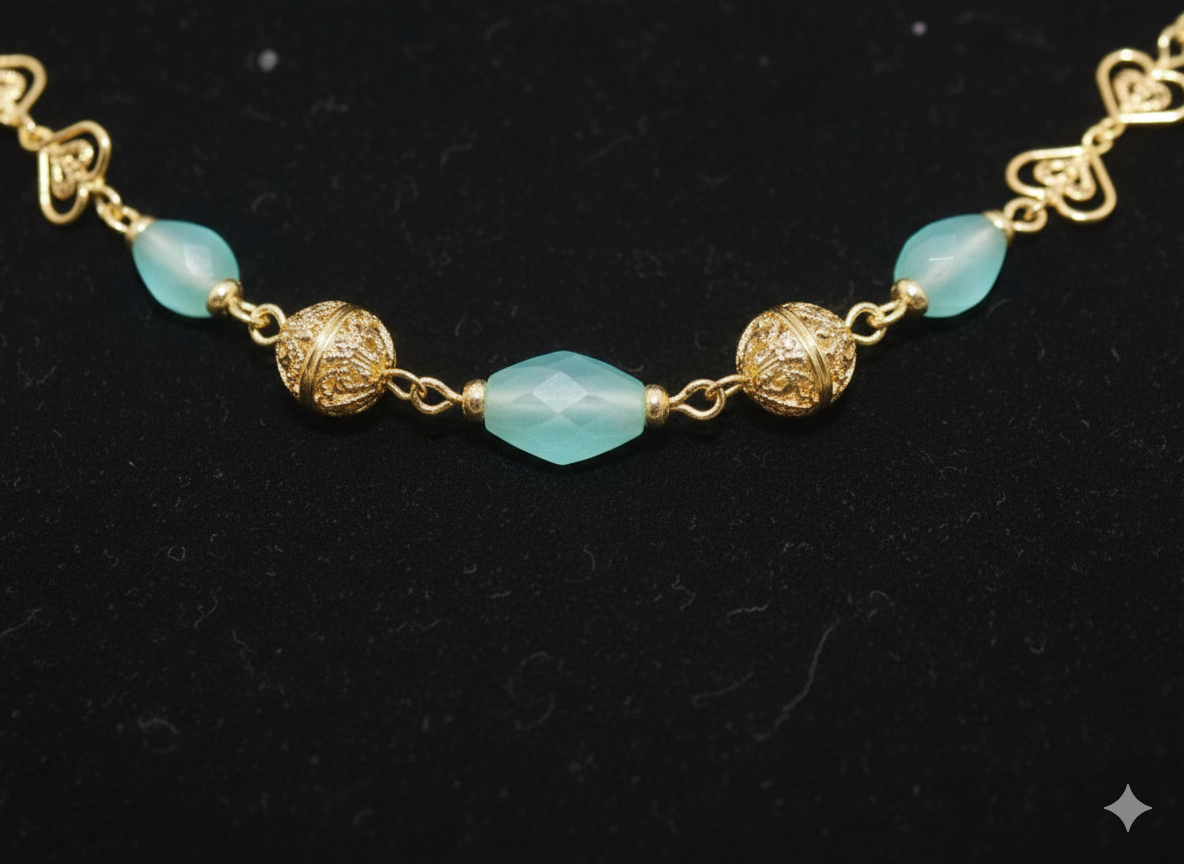 Crystal Triangle Chain is a premium quality one gram gold jewellery design crafted with durable rolled-gold coating. It offers the look of real gold while remaining affordable and lightweight. Ideal for weddings, festivals, and everyday fashion.