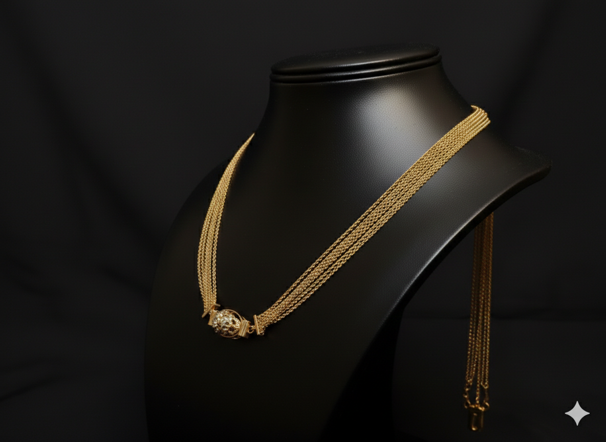 Devi Chandrahara Side Locket (L) is a premium quality one gram gold jewellery design crafted with durable rolled-gold coating. It offers the look of real gold while remaining affordable and lightweight. Ideal for weddings, festivals, and everyday fashion.